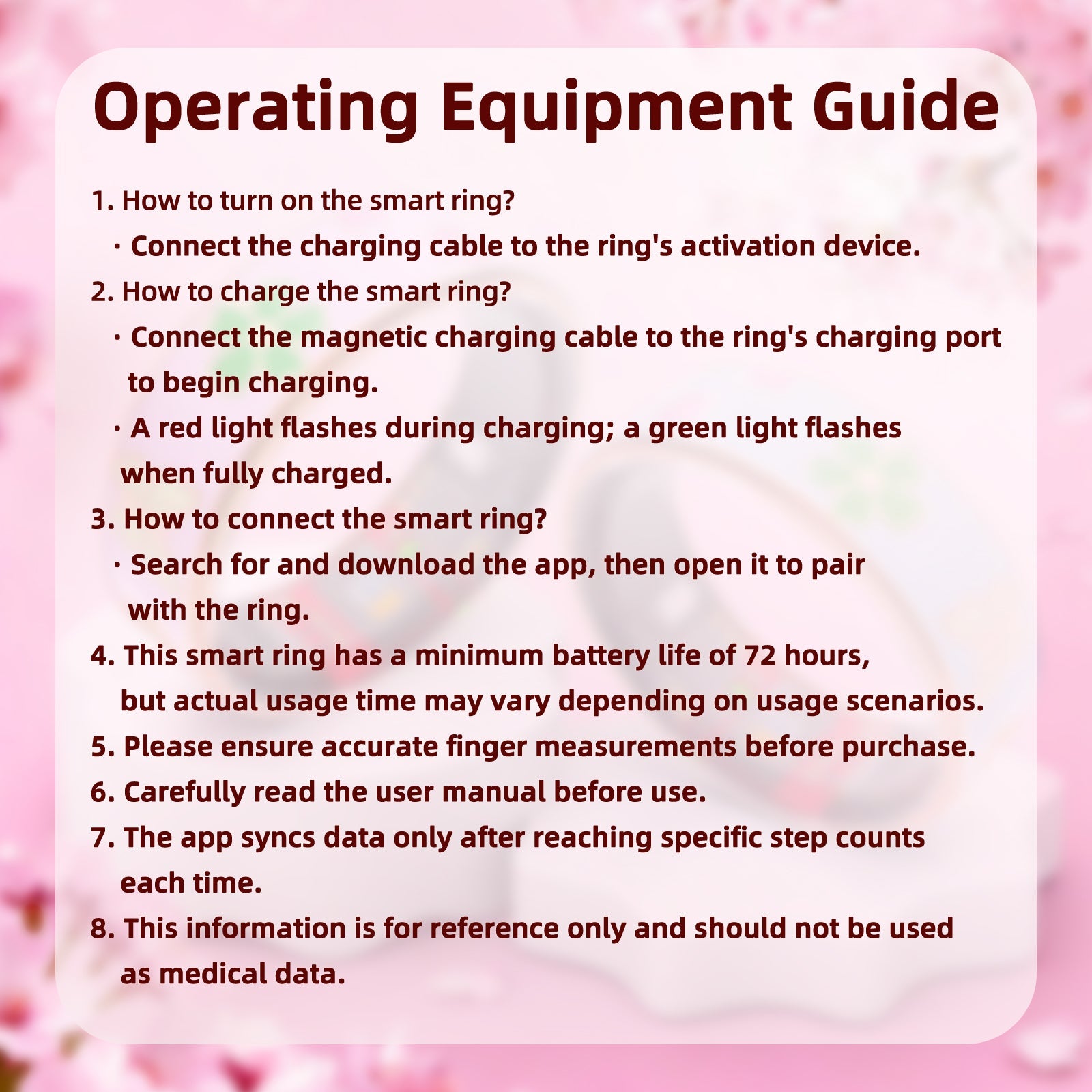 Smart Ring health tracker data can be easily viewed via a mobile appwithout subscription fees. Smart Ring supports Android 5.0 and i0s 10.0 andabove systems